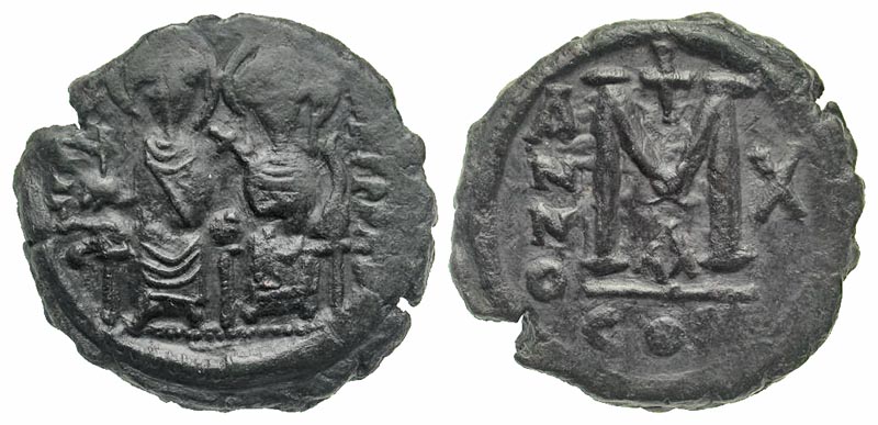Lot 58-208. Justin II. 565-578. AE follis. Constantinople mint, dated year 10 = 574/575.