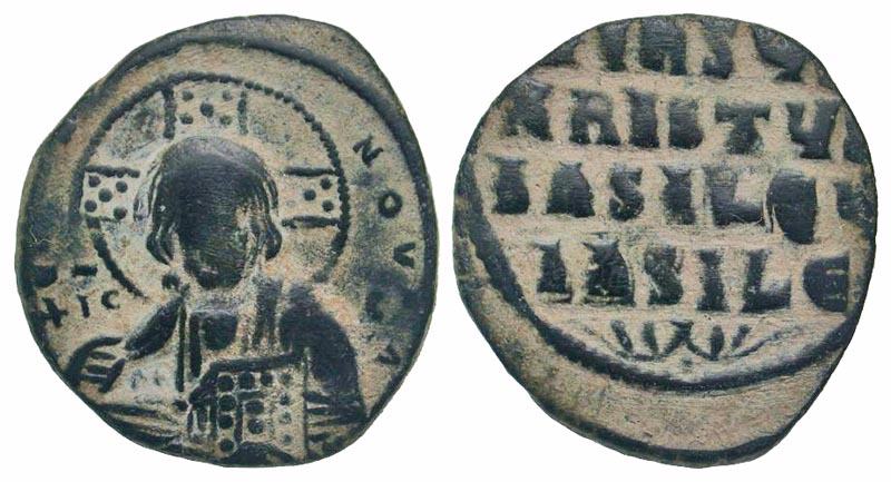 Anonymous (attributed to John I). Ca. 969-976. AE "Class A1" anonymous follis (24.4 mm, 5.17 g, 6 h). Constantinople mint. +ЄmmA NOVHA, IC-XC to left and right of bust of Christ, facing, with nimbate cross behind head, holding book of gospels / +IhSUS XRISTUS bASILEU bASILE, legend in four lines. SBV 1818; DOC A2. aVF, black patina with yellow highlights.
