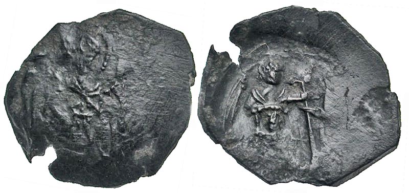 Andronicus II Palaeologus. 1282-1328. AE trachy (20.4 mm, 1.47 g, 7 h). Constantinople mint. TPIΦΛH, The Virgin orans standing facing / ANΔ, Andronicus, winged and standing eft., holding scepter and patriarchal cross. SBV 2345; DOC 569. aVF. Rare.