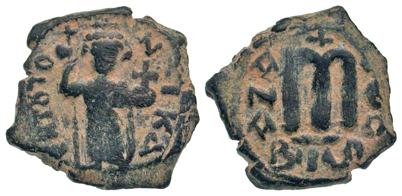 Lot 58-242. Arab-Byzantine, Umayyad Caliphate. Standing imperial figure type. 680s-ca. 693. AE Fals. Syria and Palestine mint. Based on Constans II type.