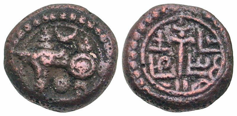 South India, Vijayanagara Empire. Shri Thirumala Raya. 15651572 . CU jital (14.9 mm, 3.51 g, 11 h). Rare. Bull standing left, daggar before / Nagari legend with symbols. K Ganesh 287. aVF.