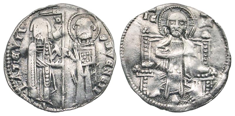 Italy, Venice. Lorenzo Tiepolo. Doge, 1268-1275. AR grosso (21.2 mm, 1.78 g, 6 h). LA · TEVPL · · S · M · VENETI, DVX, doge standing left and St. Mark, nimbate, standing facing, both holding pendant between them / IC-XC, Christ enthroned facing. CNI 2; Biaggi 2278; Papadopoli 1. gVF.