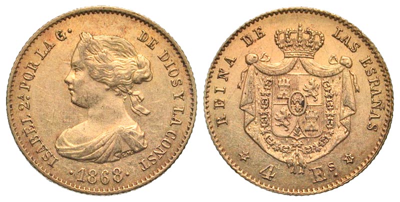 Spain. Isabel II. 1833-1868. AV 4 escudos (17.9 mm, 3.35 g, 12 h). Madrid mint, 1868. ISABEL 2A POR LA G DE DIOS Y LA CONST ·1868·, draped bust left / REINA DE LAS ESPANAS; *4 Es*, crowned coat of arms. KM 631. EF.