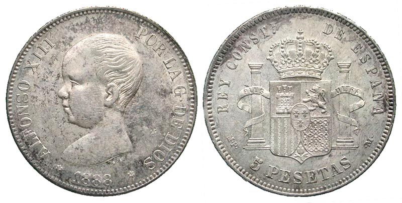 Lot 58-276. Spain. Alfonso XIII. 1886-1931. AR 5 pesetas. Madrid mint, 1888.