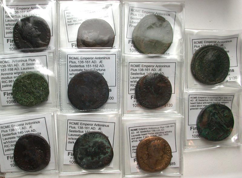 [Roman Imperial]. Lot of 11 Different Goddess Type AE Sestertii of Antoninus Pius. The lot consists of coins of the Rome mint issued from 139-159 AD. The lot has coins of 11 types: Aequitas RIC 855, Annona RIC 981, Concordia RIC 600, Fides RIC 546, Fortuna RIC 888, Indulgentia RIC 904, Liberalitas RIC 776, Libertas S 4191, Pietas RIC 1002, Salus RIC 635a & Securitas RIC 640a. The coins range in grade from aFine to VF, average Fine+. All group lots are sold as-is, returns not accepted. The coins shown are the exact coins you will receive.