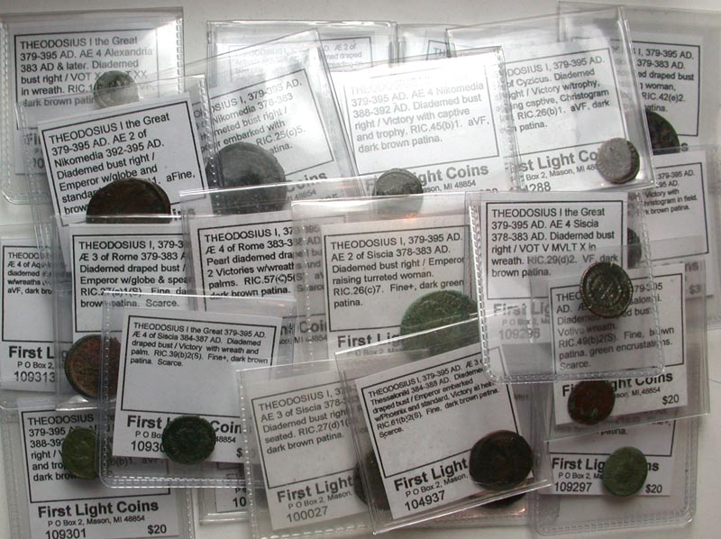 [Roman Imperial]. Lot of 24 Different AE Centenionales and Maiorinae of Theodosius I. The lot consists of 7 AE2, 5 AE3 & 12 AE4 types of these 10 mints: Alexandria, Antioch, Aquileia, Constantinople, Heraklea, Kyzikos, Nikomedia, Rome, Siscia & Thessaloniki. The lot has coins of these types: 4 Wreath, 3 Emperor spurning Captive, 3 Victory w/Captive XP in field, 2 Victory w/captive, 2 Globe and standard, 2 Turreted Woman, 2 Victories, 2 Victory at helm, 1 Equestrian, 1 Globe and spear, 1 Victory w/wreath, & 1 Roma. The coins range in grade from aFine to VF+, average aVF. All group lots are sold as-is, returns not accepted. The coins shown are the exact coins you will receive.