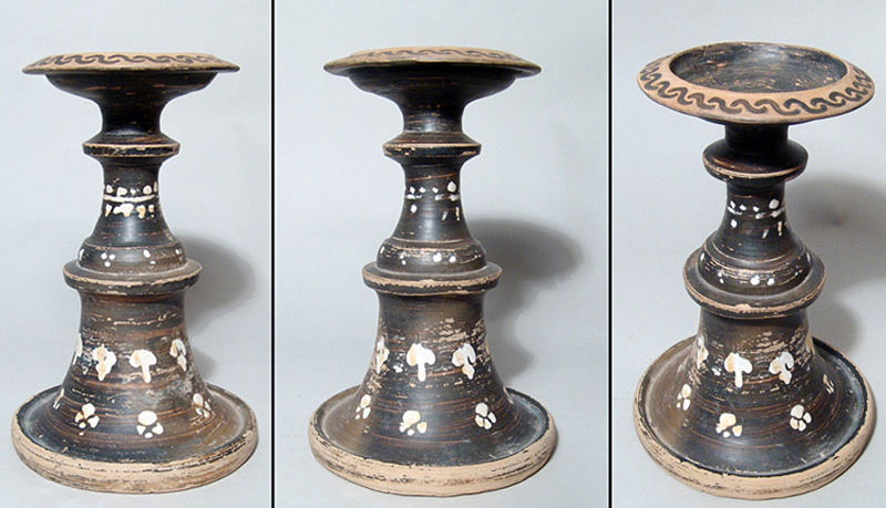 A Greek Gnathian-Ware Thymiaterion or Incense Burner. A Greek Gnathian-ware Thymiaterion or Incense burner, Magnia Graecia, c. 4th Century BC, nicely decorated with a laurel band, bunches of grapes and rosettes, an interlocking border around the rim. H: 7” (17.8 cm). Some restoration to rim. A nice example of this scarcer pottery form. Ex Orange County private collection. Value Range: $800-$900.