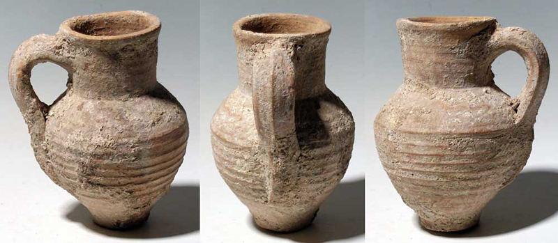 Small Roman Juglet. A lovely Roman juglet, c. 1st - 3rd Century AD. This nicely formed vessel is 4-1/2” high and stands on a narrow flat base. The chamber and loop handle are decorated with pronounced ridges. Good mineral encrustation, nice example of the type. Ex Funiciello collection. Value range: $165 - $300.