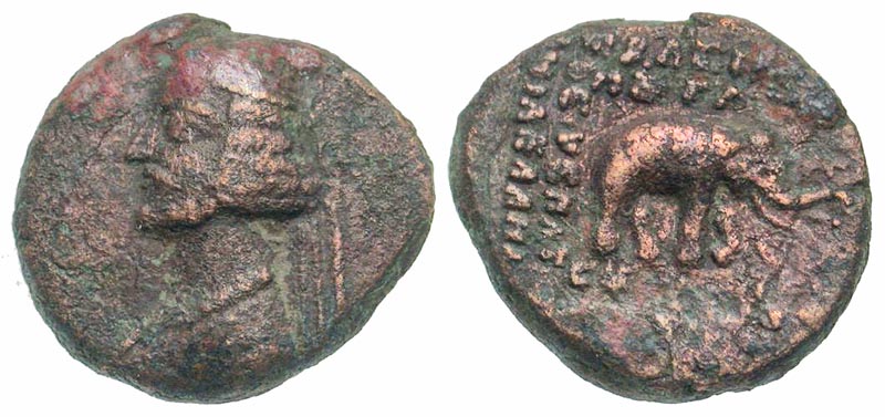 Parthian Kingdom. Mithradates IV. 58/7-55 B.C. AE tetrachalkon (16.3 mm, 3.21 g, 11 h). Mithradatkart mint. Diademed and draped bust left, wearing torque and short beard / Elephant standing right, monogram below trunk. Sellwood 40.18 (Mithradates III); Shore -. Fine. Very Rare.