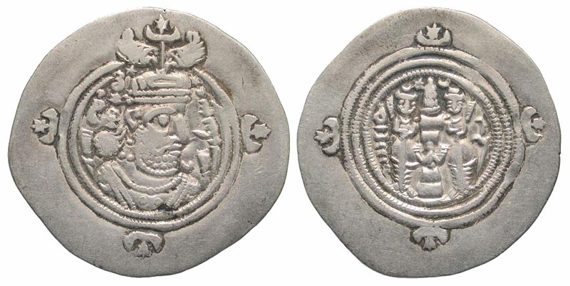 Lot 59-074. Sasanian Kingdom. Khusru II. A.D. 591-628. AR drachm. GD (Jayy) mint, dated RY 14.