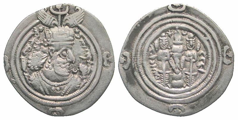 Lot 59-075. Sasanian Kingdom. Khusru II. A.D. 591-628. AR drachm. AS (Asfahan) mint, dated RY 14.