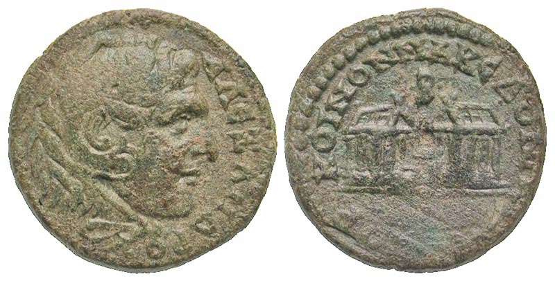 Koinon of Macedon. Time of Gordian III. A.D. 238-244. AE 27 (26.8 mm, 10.33 g, 7 h). AΛEXANΔPOY, head of Alexander the Great right, wearing lion's skin headdress / KOINON MAKEΔONΩN B NЄΩKOP, two temples seen in perspective. AMNG 743 var; SNG Cop 1379 var; BMC 110 var. VF. Scarce.