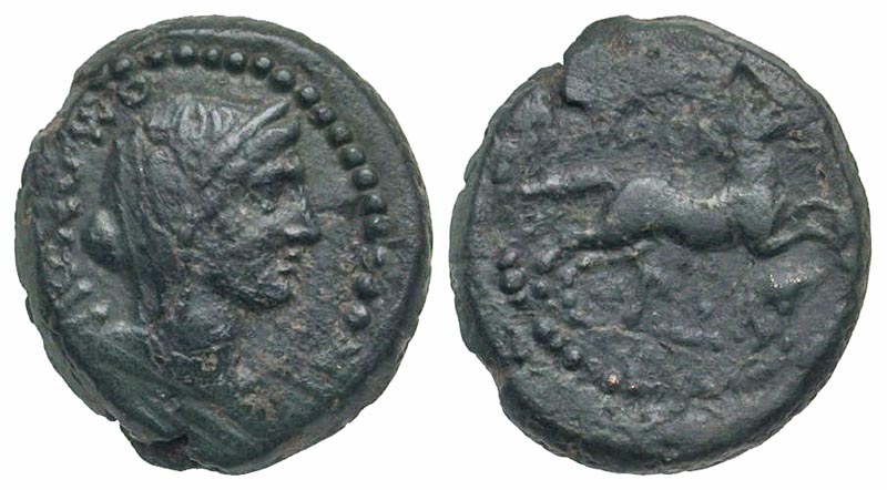 Macedon, Thessalonica. Civic Issue. Ca. 37 B.C. AE 20 (19.8 mm, 4.81 g, 6 h). OMONOIA, Veiled and diademed bust of Homonoia right / ΘΕΣ-ΣΑΛΟΝ/PΩM, horse galloping right. RPC 1553; SNG ANS 806; SNG Cop 378. Fine. Scarce variety.