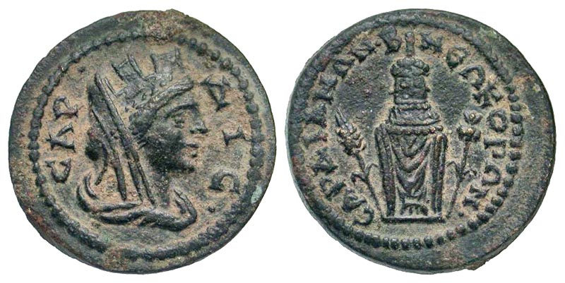 Lydia, Sardes. Civic Issue. Ca. 200-133 B.C. AE 17 (20.8 mm, 4.29 g, 7 h). CAPΔIC, turreted and veiled head of Tyche right / CAΡΔIANΩN B NEΩKOΡΩN, cult statue of Kore facing, draped and wearing kalathos, between ear of grain and poppy. SNG von Aulock 3141; SNG München 503; BMC 92. VF, sandy patina.