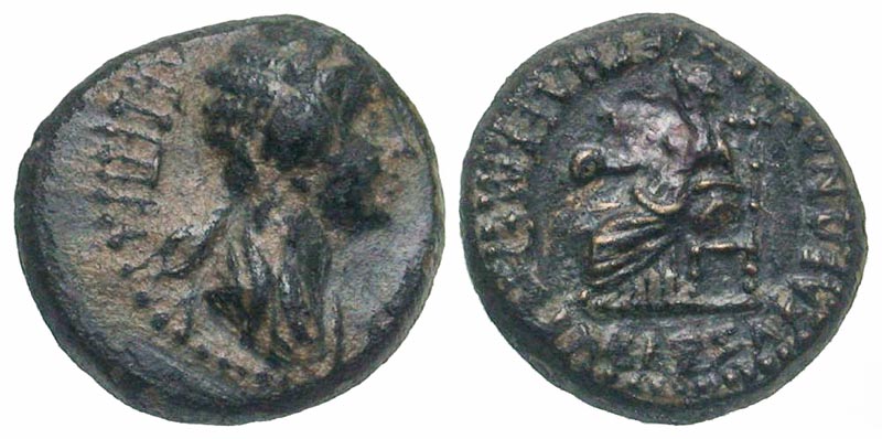 Phrygia, Eumeneia. Agrippina II. Augusta, A.D. 50-59. AE 16 (16.3 mm, 3.13 g, 1 h). Struck under Nero, ca AD. 54-55. Bassa Kleonos, archierea. AΓPIΠEINA ΣEBAΣTH, draped bust right / BACCA KΛEΩNOC EYMENEΩN, Cybele seated left, elbow resting on drum; lion at her feet. RPC 3151; BMC 44; Von Aulock, Phrygiens -. aVF, black patina with red highlights.