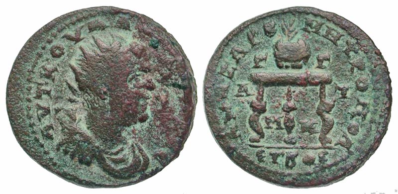 Cilicia, Anazarbus. Valerian I. A.D. 253-260. AE 27 (24.9 mm, 11.01 g, 5 h). Dated year 272 (253/254 A.D.). AVT K OVAΛEPIANOC CE, radiate, draped, and cuirassed bust right, seen from the front / ANAZAP MHTPOΠOΛ P; Γ-Γ/A-T/M-K, ETBOC, Prize urn, containing palm frond, set upon agonistic table with three decorated legs. Ziegler 17; SNG France 2144; SNG Levante 1524; SNG von Aulock 5512. F/VF, red-brown patina with green highlights.