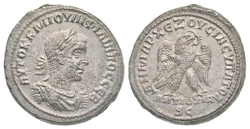 Syria, Seleucis and Pieria. Antiochia ad Orontem. Philip II. A.D. 247-249. BI tetradrachm (28.2 mm, 13.96 g, 1 h). Dated A.D. 248-249. AVTOK K M IOVΛI ΦIΛIΠΠOC CEB, laureate, draped, and cuirassed bust right / ΔHMAPX EΞOVCIAC VΠATO Δ, ANTIOXIA SC, eagle standing right, holding wreath in beak, with wings spread. Prieur 474; McAlee 1042; SNG Cop 268 corr (Philip I). VF, light porosity.