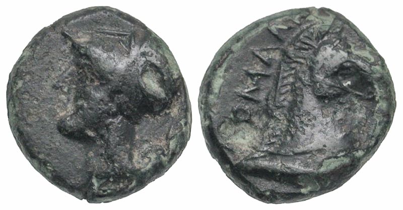 Anonymous. ca. 269 B.C. AE litra (17.0 mm, 3.86 g, 5 h). Rome mint. ROMANO, Head of Minerva left wearing Corinthian helmet / ROMANO, horses head right. Crawford 17/1a; Sydenham 3; HN Italy 278. aVF, black patina with green highlights.
