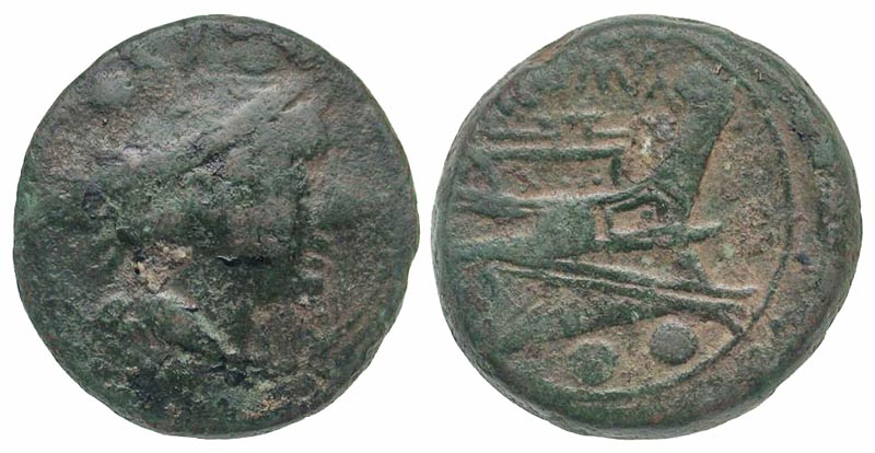 Anonymous. 217-215 B.C. AE sextans (27.3 mm, 14.78 g, 4 h). Rome mint. Head of Mercury right, two pellets above / ROMA, prow right, two pellets below. Crawford 38/5; Sydenham 85. F/VF, green and red patina.