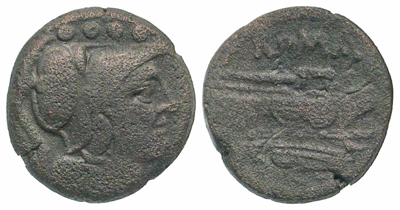 Anonymous. 215-212 B.C. AE triens (20.4 mm, 5.83 g, 11 h). Post-Semilibral standard. Rome mint. Helmeted head of Minerva right; four pellets above / ROMA, prow of galley right; four pellets below. Crawford 41/7b; Sydenham 105. Fine.