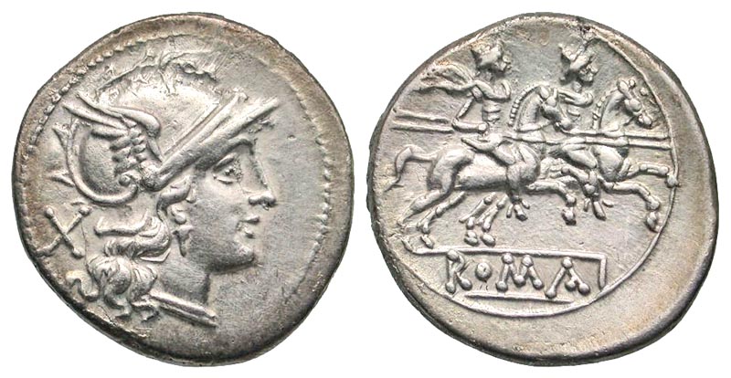 Anonymous. after 211 B.C. AR denarius (21.3 mm, 3.82 g, 2 h). Rome mint. Helmeted head of Roma right; X behind / ROMA in relief in rectangular linear frame, the Dioscuri riding right, holding spears, star above each. Crawford 53/2; Sydenham 229; cf. RSC 2. gVF.