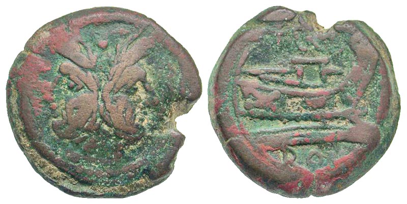 C. Papirius Turdus. Ca. 169-158 B.C. AE as (31.9 mm, 21.02 g, 8 h). Rome mint. Laurete head of Janus, I above / TVRD / ROMA, prow of galley right; I to right. Crawford 193/1; Sydenham 366. Fine, flan chip, green and red patina. Scarce.