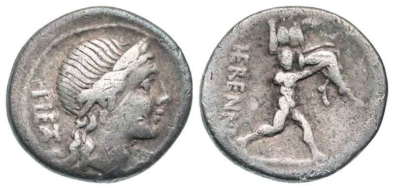 Lot 59-163. M. Herennius M.f. 108-107 B.C. AR denarius. Rome mint.