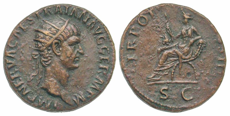 Lot 59-188. Trajan. A.D. 98-117. AE dupondius. Rome mint, struck A.D. 117. Ex D. Thomas collection.