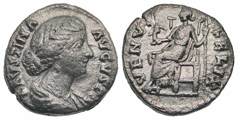 Faustina II. Augusta, A.D. 147-175. AR denarius (17.4 mm, 2.93 g, 5 h). Rome mint, struck A.D. 161-175. FAVSTINA AVGVSTA, draped bust right / VENVS FELIX, Venus seated left on throne, holding Victory and scepter. RIC 721 (M. Aurelius); RSC 226. VF.