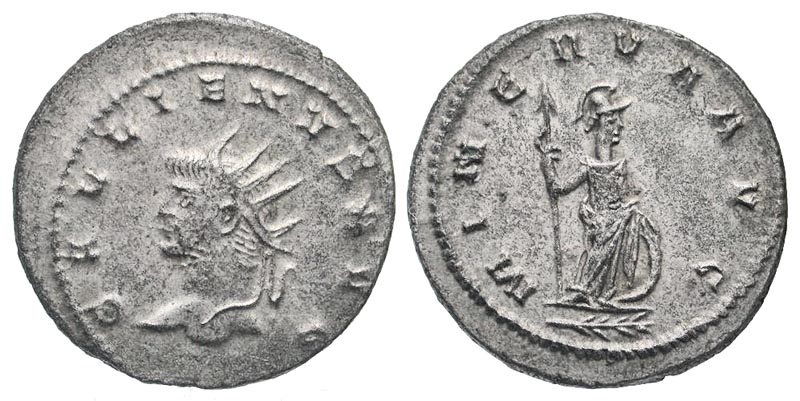 Gallienus. A.D. 253-268. AE antoninianus (21.9 mm, 3.72 g, 5 h). Antioch mint, struck A.D. 265-266. GALLIENVS AVG, radiate head left / MINERVA AVG, Minerva standing facing, head right, holding spear and resting hand on shield; branch in exergue. Göbl 1634a; RIC 651; RSC 635a. Toned VF, silvered.