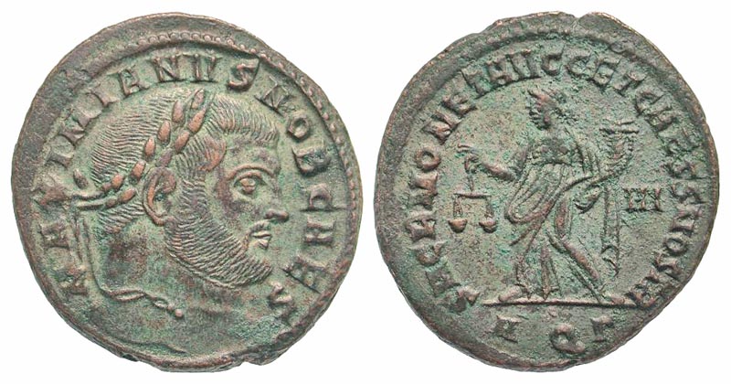 Galerius. As Caesar, A.D. 293-305. AE follis (31.1 mm, 12.90 g, 11 h). Aquileia mint, struck A.D. 300. MAXIMIANVS NOB CAES, laureate head right / SACRA MON VRB AVGG ET CAESS NN, Moneta standing left, holding scales and cornucopia; star in right field, [AQ] in exergue. RIC 30 vvar. VF, green patina.