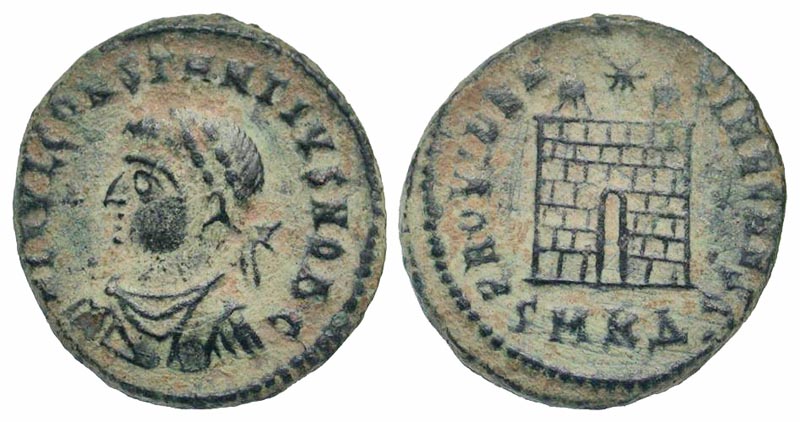 Constantius II. As Caesar, A.D. 324-337. AE follis (18.7 mm, 2.79 g, 11 h). Cyzicus mint, struck A.D. 325-326. FL IVL CONSTANTIVS NOB C, laureate, draped and cuirassed bust left / PROVIDENTIAE CAESS·, campgate with two turrets and one star above, SMKΔ· in exergue. RIC 38; LRBC 1175. VF, sandy patina.