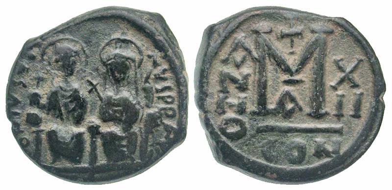 Justin II. 565-578. AE follis (29.8 mm, 12.91 g, 1 h). Constantinople mint, dated year 12 = 576/577. D N IVSTINVS PP AV, Justin II and Sophia seated on throne facing, both nimbate; he holds a globus cruciger while she holds a cruciform scepter / Large M, ANNO to left, Christogram above, X/II to right, A below, CON in exergue. SBV 360; DOC 42a. Fine.
