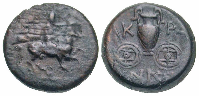 Thessaly, Krannon. ca. 350-300. AE dichalkon (17.3 mm, 4.28 g, 11 h). Thessalian horseman galloping right, wearing petasos and chlamys / K-PA/NNO, hydria on cart. BCD Thessaly 119.2; Rogers 197; SNG Cop 43. F/VF.