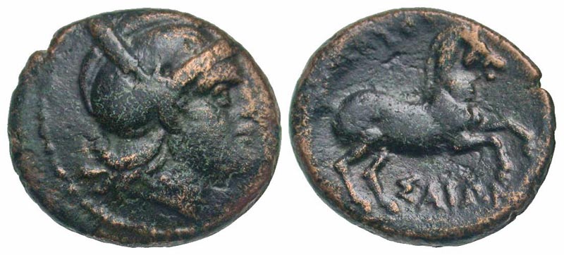 Thessaly, Skotussa. 3rd century B.C. AE dichalkon (19.9 mm, 4.83 g, 11 h). Helmeted head of Ares or Athena right, wearing pearl necklace / ΣKOTOYΣ-ΣAIΩN, bridled horse prancing right. BCD 752; Rogers 547. Fine.