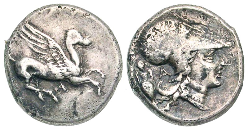 Akarnania, Leukas. Ca. 320-280 B.C. AR stater (20.6 mm, 8.33 g, 12 h). Pegasos flying right; Λ below / Helmeted head of Athena right; amphora and A behind. Pegasi 128; BCD Akarnania 275. Toned aVF.