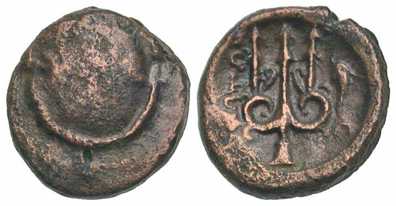 Boiotia, Federal coinage. Ca. 300-250 B.C. AE 14 (14.3 mm, 2.22 g, 11 h). Boeotian shield / BOIΩTWN, ornamented trident, dolphin to right. BCD 77; BMC 108. VF.