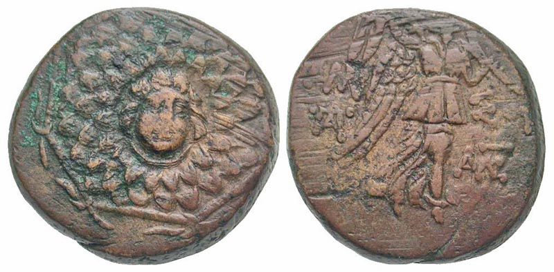 Pontos, Amisos. Under Mithradates VI Eupator. Ca. 85-65 B.C. AE 22 (22.13 mm, 8.42 g, 11 h). Aegis with Gorgoneian at center / AMI-ΣOΣ, Nike advancing right, holding palm; monograms flanking. Rec Gen 44; SNG BM 1185. VF.