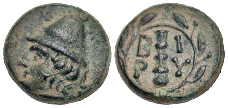 Troas, Birytis. ca. 350-300 B.C. AE 11 (10.5 mm, 1.36 g, 6 h). Head of Kabeiros left, wearing pilus / B-I-P-Y, club within wreath. SNG Cop 249; SNG Von Aulock 1502 var (denomination). VF.