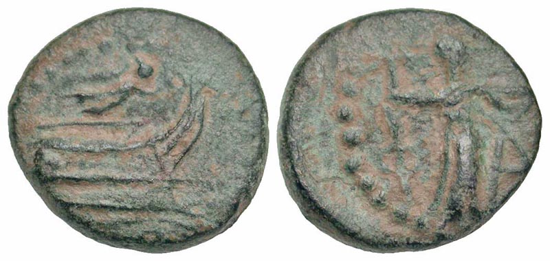 Lycia, Phaselis. Ca. 190-167 B.C. AE 18 (17.7 mm, 3.79 g, 11 h). Prow of galley right; above, Nike flying right, holding wreath / Φ-A, Athena advancing right, brandishing spear and holding shield. SNG Cop 126; SNG von Aulock 4439; BMC 18. VF/F.