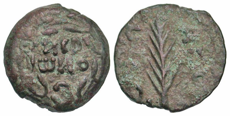 Judaea, Procurators. Porcius Festus. 59-62 C.E. AE prutah (16.1 mm, 1.84 g, 10 h). Jerusalem mint, dated year 5 = 58/59 C.E. Procurator under Nero. NEP/WNO/C, legend within wreath, bottom tied with X / LЄ KAICAPOC, palm branch. Hendin 1351; Meshorer TJC 345; RPC 4972. Fine, minor green deposits.