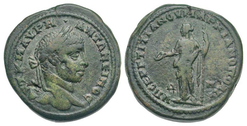 Lot 60-097. Moesia Inferior, Marcianopolis. Elagabalus. A.D. 218-222. AE pentassarion. Struck A.D. 222. Sergius Titianus, consular legate.