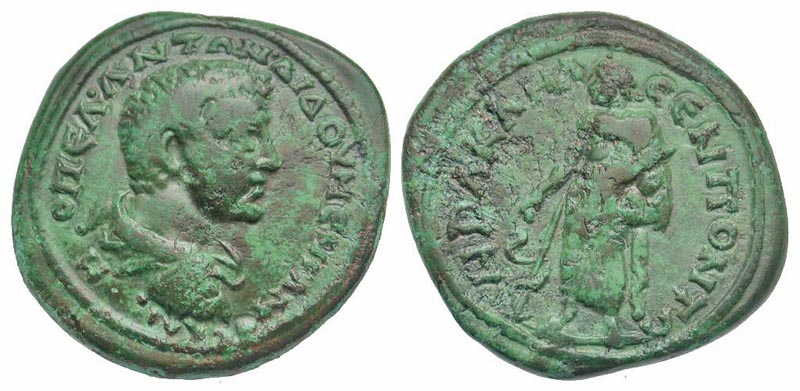 Bithynia, Heracleia Pontica. Diadumenian. As Caesar, A.D. 217-218. 25.6 mm, 8.23 g, 7 h). M OΠЄΛ·ANTΩN·ΔIΔOVMЄNIANOC KAI, bare-headed, draped and cuirassed bust right / HPAKΛHAC ЄN ΠONTΩ, Asklepios standing left, leaning on serpent-entwined staff. Rec Gen 179; SNG von Aulock 399; BMC -; Corsten -. gVF, mottled green and brown patina, minor porosity.