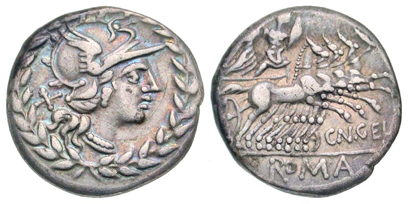 Cn. Gellius. 138 B.C. AR denarius (18.3 mm, 3.79 g, 4 h). Rome mint. Helmeted head of Roma right; X behind; all within laurel wreath / CN·GEL / ROMA, Mars driving galloping quadriga right, holding shield, and grasping Nerio standing beside him. Crawford 232/1; Sydenham 434; RSC Gellia 1. VF. Scarce.