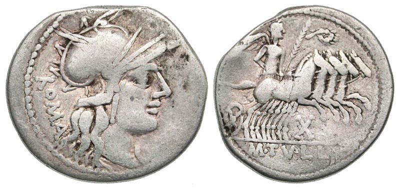 M. Tullius. 120 B.C. AR denarius (21.9 mm, 3.74 g, 1 h). Rome mint. ROMA, helmeted head of Roma right / M·TVLLI, Victory driving quadriga right, holding reigns and palm, wreath above, X below horses. Crawford 280/1; Sydenham 531; RSC Tullia 1. Fine.