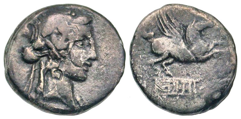 Q. Titius. 90 B.C. AR denarius (17.3 mm, 3.59 g, 4 h). Rome mint. Head of young Bacchus (or Liber) right, wearing ivy wreath / Q·TITI, Pegasus springing right from tablet. Crawford 341/2; Sydenham 692; RSC Titia 2. Toned Fine.