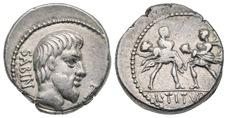 L. Titurius L.f. Sabinus. 89 B.C. AR denarius (18.6 mm, 3.79 g, 6 h). Rome mint. SABIN, Bare head of Tatius right; TA monogram to right of chin / L·TITVRI, two soldiers, facing each other, each carrying off a Sabine woman. Crawford 344/1a; Sydenham 698; RSC Tituria 1. aVF, off center.