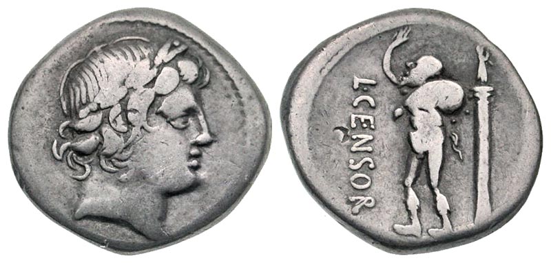 L. Marcius Censorinus. 82 B.C. AR denarius (17.9 mm, 3.71 g, 11 h). Rome mint. Laureate head of Apollo right / L·CENSOR, satyr Marsyas standing left, with wine skin over shoulder; behind, a column surmounted by a draped figure. Crawford 363/1d; Sydenham 737; RSC Marcia 24. Toned Fine.