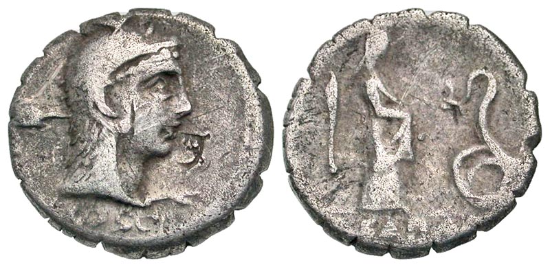 The reverse design refers to an annual ritual that took place at the temple of Juno Sospita in Lanuvium in which a virgin descended into the temple to feed a serpent.