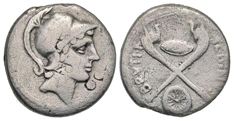 D. Junius Brutus Albinus. 48 B.C. AR denarius (18.0 mm, 3.50 g, 5 h). Rome mint. Helmeted head of Mars right / ALBINVS·BRVTI·F, two crossed Gaulish trumpets; between, oval shield above, round shield below. Crawford 450/1a; Sydenham 941; CRI 25; RSC Postumia 11. Fine, banker's marks.